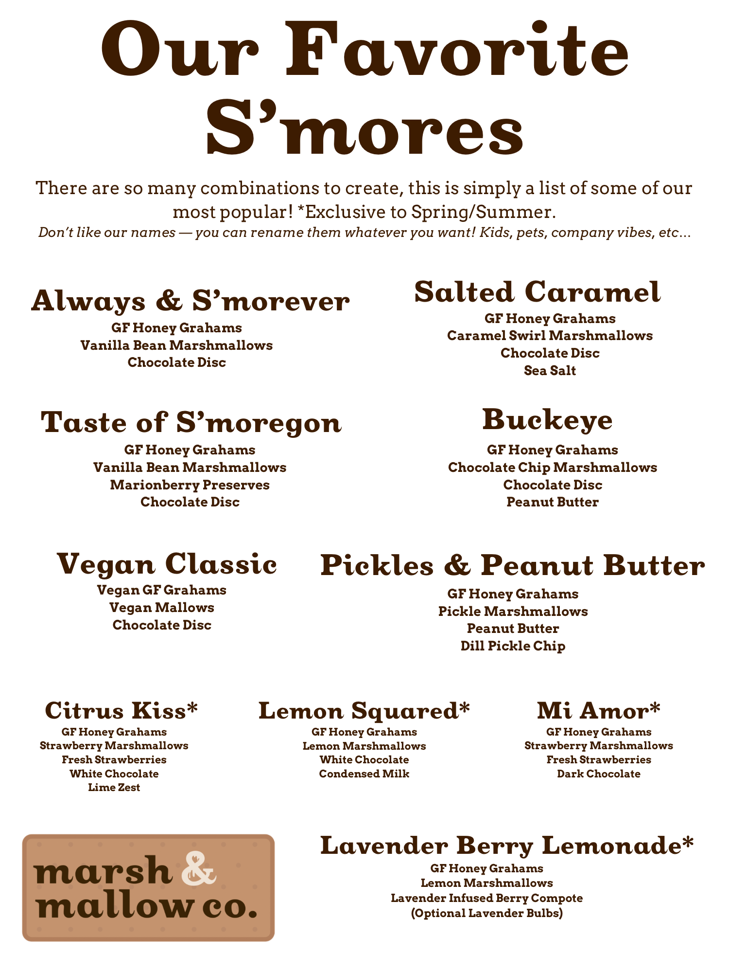 Our summer menu is here, if you’d like to set up a pre-booking tasting: click here! You & 3 folks get to try our s’mores flight for $25. When you book us, the $25 will be applied to your total. You’ll also get another tasting - complimentary to try your in-season flavors once we get closer!